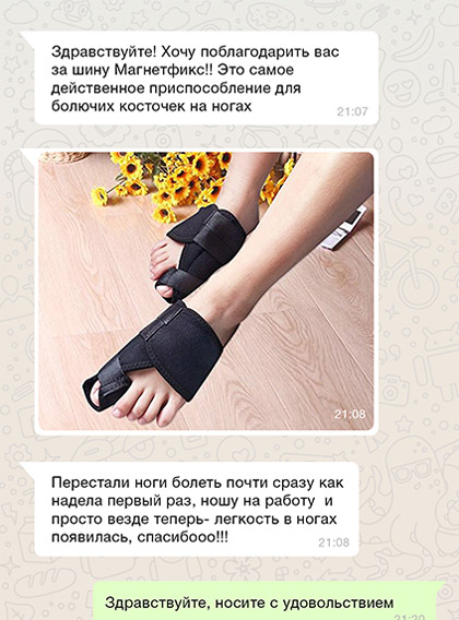 Чтобы купировать воспалительный процесс, достаточно использовать магнитную шину FootRelax ежедневно в течение 3-5 часов. Это способствует не только выравниванию фаланг пальцев и уменьшению деформации, но также благодаря воздействию магнитов происходит стимуляция нервных окончаний, повышается тонус тканей, улучшается кровообращение. FootRelax фиксирует большой палец в нужном положении, снижает нагрузку на ступни, купирует боль, облегчает ходьбу и возвращает здоровья ступням.